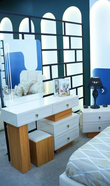 سرویس خواب دونفره مدرن شامل تخت خواب کف تخت فلزی با پایه های متصل، کنسول و آینه با صندلی و دو عدد پاتختی می باشد.
