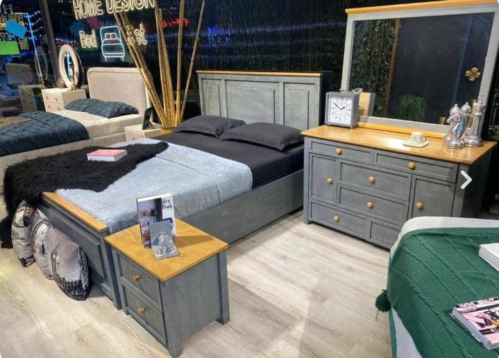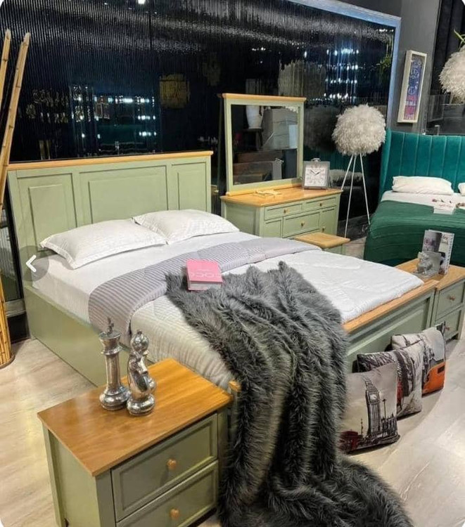 سرویس خواب دلوان شامل تخت، دراور با آینه و کمد آرایشی دو پاتختی وفایل 4کشو با رنگ پلی اورتان